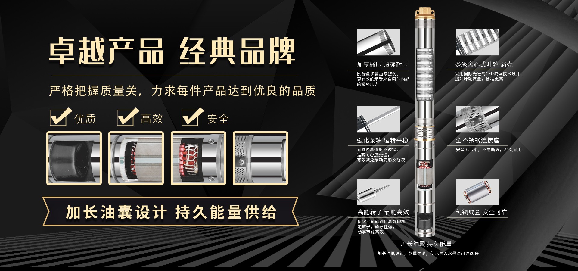 不僅僅是泵,更是流動的科技。十多年來,本公司堅持走:以質量求生存以科技創新求發(fā)展,重合同守信用的道路,生產經營得到迅速發(fā)展。更希望以后不管從發(fā)達城市到新農村,從工業制造到尖端科技產業都隨處可見創江井泵的身影,創江深井泵已成為干萬用戶心目中優(yōu)質和信心的保證我們將以優(yōu)質的產品和最完善的售后服務來真誠與各界朋友開展廣泛的合作,共同創造一個美好的未來!